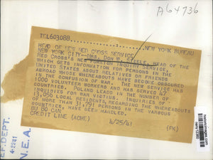New York City--Mrs. Don W. Steele, head of the Red Cross's new Foreign Inquiry Service, which gets information for persons in the United States about relatives or friends abroad whose whereabouts have become obscured in the confusion of war. The new service has 1000 volunteer workers and has served 47 countries. Poland leads in the number of inquiries for war victims. Inquiries of 13,056 local residents, regarding the whereabouts of more than 31,791 persons in the various countries, have been handled.