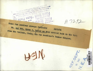 From: Pan American Airways Publicity. Mr. and Mrs. Myron C. Taylor as they arrived back in the U.S. from the Vatican, Italy, via Pan American's Yankee Clipper.