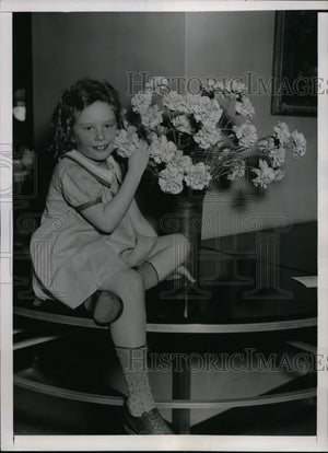 Little Louise Levine, of Long Island City, N.Y., is pictured with the blue ribbon undisseminated carnation seedlings exhibited by S.J. Goddard, of Farmingham, Mass.,at the Carnation Show being held in Horticultural Hall, Rockefeller Center, New York City, starting February 14.
