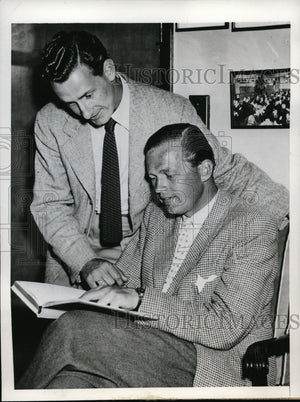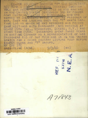 Henry Soderberg, seated, Swedish YMCA War Secretary, is greeted on his arrival by former Army Captain William Burghardt, who was served by Soderberg while a German prisoner of war. They are looking over the log in which had recorded his prison camp meetings. He is in the US for a cross country lecture tour before EX POW clubs and "Y" groups.