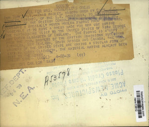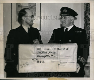 New York, N.Y.--This packet, handed over by Capt. J.D. Townley (right), of the U.S. Aquitania, to Christopher Kemball, of the British Consulate, April 26, contains a specially woven woolen fabric from which Mrs. Roosevelt is to have a dress made for her use during the forthcoming visit to the United States of King and Queen Elizabeth of England. The fabric is a gift from the wool growers of the British Dominicans including Australia, New Zealand, South Africa and Canada. The wool growers of the United States are making a similar gift to Queen Elizabeth, the material having already been sent to the Queen.