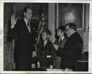 Mayor Fiorello H LaGuardia (right) as he administered the oath of office of President of the City Council to Newbold Morris (left) at City Hall, Dec 23. During the ceremony the Mayor hinted that he might leave duties of the Mayor's office to Morris who as Councilman President serves as acting mayor in the mayor absence, when he said to him "be prepared to assume this office." LaGuardia, as National Civilian Defense Director has found that this job is becoming more demanding and it has been rumored that he will five all of his time to it in the near future. With the 2 officials in the above photo are Bobby Morris, 9, (left-center) and Peter Morris, 10, sons of the councilman president, who is serving his 2nd term in that office.