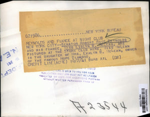 Senator Robert Rice Reynolds & his fiance, Ms Evalyn W. McLean, are shown at the Stork Club. Ms McLean is the daughter of Mrs Evalyn W. McLean, owner of the Famous Hope Diamond.
