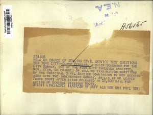 Clyde Perkins, one of the 4 City employees arrested on charges of selling exam questions of the Municipal Civil Service Commission to men seeking jobs with the Independent Subway. He was released on a $2,000 bail.