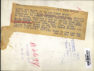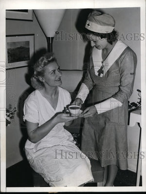 Miss Margaret Thoresson, private secretary to former Prime Minister Van Zeeland of Belgium recieves a cup of coffee from Mrs JL Kraus, Red Cross nurse at the Red Cross blood donor center here Dec 11th after donating her blood as the Red Cross opened its Alien Blood Donor Week