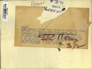 Senator Henry Cabot Lodge Jr of Massachusetts speaking at the Lincoln Day Dinner of the Associated Republican Clubs of King County held at the St George Hotel Brooklyn. Lodge assailed the US policy on foreign trade as tending to involve the United States in Foreign Wars.
