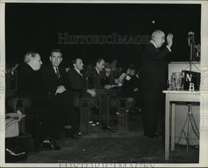 GOV HERBERT LEHMAN SPEAKS AT THE RALLY OF THE AMERICAN LABOR PARTY. SEATED BEHIND HIM LTR: LUIGI ANTONINI; HENRY A WALLACE; LIEUT GOV CHARLES POLETTI AND SEN JAMES M. MEAD, WHO IS RUNNING FOR RE-ELECTION AS U.S. SENATOR FROM NY.