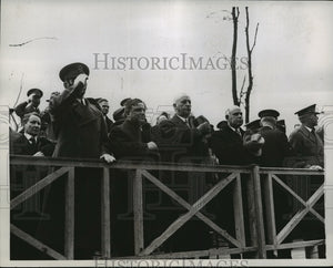 MAJOR GENERAL DENNIS E NOLAN GRAND MARSHAL OF THE MARADE, MAYOR FIORELLO H LAGUARDIA POLICE COMMISSIONER O'RYAN AND GOVERNOR LEHMAN OF NEW YORK (LEFT TO RIGHT) PICTURED AS THEY SALUTED THE FLAG AS IT PASSED IN THE ARMY DAY PARADE ON FIFTH AVENUE NEW YORK CITY APRIL 7TH. THE 17TH ANNIVERSARY OF THE ENTRANCE OF THE UNITED STATES IN THE WORLD WAR. RAIN STOPPED AND THE SUN APPEARED DURING THE PARADE.