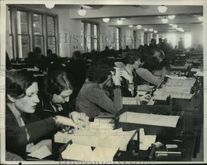 ACCORDING TO MR BAYARD POPE EXECUTIVE CHAIRMAN OF THE NEW YORK UNEMPLOYMENT RELIEF COMMITTEE THERE ARE 2,100,000 PERSONS EMPLOYED IN NEW YORK CITY WHO WILL BE ASKED TO CONTRIBUTE THE SUM OF 12,000,00 TOWARD THE FUND FOR RELIEF OF NEW YORK'S UNEMPLOYED. ABOVE PHOTO SHOWS GIRLS IN THE NEW YORK MAIN OFFICE OF THE COMMITTEE FILING NAMES OF THOSE WHO WILL BE ASKED TO CONTRIBUTE.