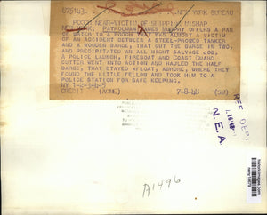 Patrolman James Murphy offers a pan of water to a pooch that was alost a victim of a accident between a steel prowed tanker and a wooden barge that cut the barge in two and precipitated an all night salvage job A police launch, fireboat and Coast Guard cutter went into acction and hauled the half barge that stayed afloat ashore where they found the little fellow and took him to a police station for safe keeping