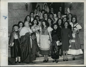 FRANCIS CARDINAL SPELLMAN ARCHBISHOP OF NEW YORK IS PICTURED OUTSIDE ST PATRICK'S CATHEDRAL WITH MANHATTANVILLE COLLEGE STUDENTS AFTER SOLEMN HIGH MASS TODAY MARCH 16 WHICH LAUNCHED THE BISHOPS' RELIEF CAMPAIGN FOR VICTIMS OF WAR. THE GIRLS ARE DRESSED IN THE NATIVE COSTUMES OF 21 WAR STRICKEN NATIONS