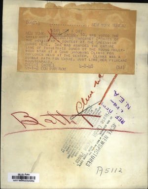 MARLA GARDO, 10, WAS VOTED THE CHILD MOST RESEMBLING MARGARET O'BRIEN OF THE MOVIES AT A CONTEST AT THE GREENWICH HOUSE. SHE WAS AWARDED THE ENTIRE LINE OF TOILETRIES OWNED BY THE HOLLYWOOD STAR AT A GOOD GROOMING CLINIC FOR CHILDREN.