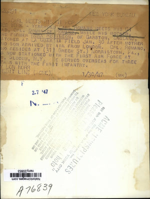 Year old Carl Romano meets is GI dad, CPL Dominick Romano, while his mother the former Nora Robinson, of Garston, England , watches at LA Guardia Field Jan 30 after mother and son arrived by air from London. CPL Romano who resides at 31 Green St. Norristown, PA. is now stationed with the First Air Force at Slocum, NY. He served overseas for three years with the First Infantry.