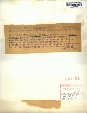 PEDRO TORRES, ACCOMPANIED BY MRS. TORRES LEAVES PENN STATION SHORTLY AFTER HIS ARRIVAL IN NY FOR D.C., WHERE, HE WILL DISCUSS WITH PRES ROOSEVELT ECONOMIC QUESTIONS.