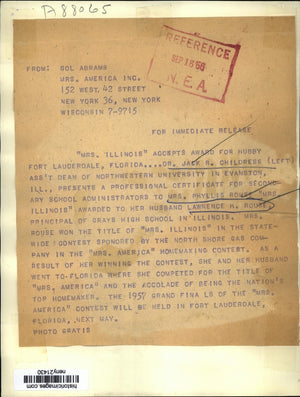 DR. JACK R. CHILDRESS (C), PRESENTS A PROFESSIONAL CERTIFICATE FOR SECONDARY SCHOOL ADMINISTRATIONS TO LAWRENCE H. ROUSE, PRINCIPAL OF THE GRAYS LAKE HIGH SCHOOL. ROUSE IS THE HUSBAND OF MRS. PHYLLIS ROUSE, CURRENT "MRS. ILLINOIS" WHO LOOKS ON IN ADMIRATION.