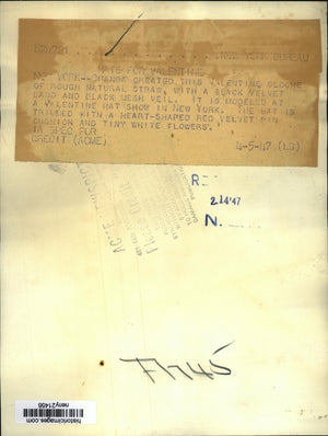 Chanda created this Valentine Cloche of rough natural straw with a black velvet band and black mesh veil. It is modeled at a Valentine Hat Show in New York. The hat is trimmed with a heart shaped red velvet pin cushion and tiny white flowers..
