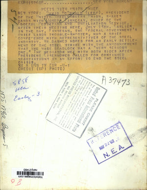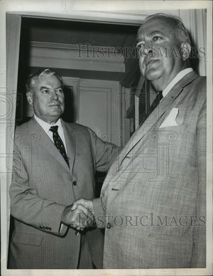 David McDonald on left president of United Steelworkers Union shakes hands with Joseph Finnegan Chief of the Federal Mediation and Conciliation Service after their meeting here July 15th Earlier in the day Finnegan the Federal government's chief labor trouble shooter had a brief conference with reps of the steel industry. He dashed hopes for an early settlement o fthe steel strike with announcement that the wage deadlock was a very serious one The mediator met with both sides after President Eisenhower called for continued negotiations in effort to end the steel crisis