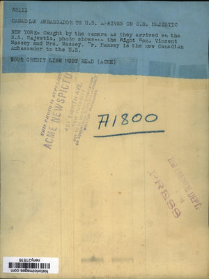 HON. VINCENT MASSEY & MRS. MASSEY ARRIVING ON THE S.S. MAJESTIC.