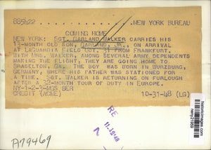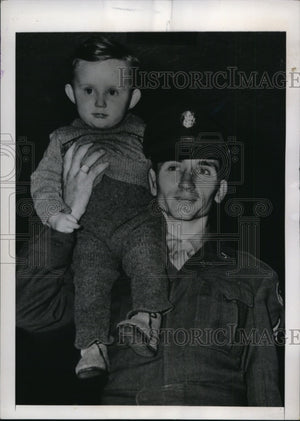 Sgt Garland Walker carries his 13 month old son Garland Jr on arrival at LaGuardia Field Oct 31 from Frankfurt with Mrs Walker among several Army dependents making the flight, they are going home to Braselton GA The boy was born in Wurzburg Germany where his father was stationed for a time. Sgt Walker is returning on furlough after a 32 month tour of duty in Europe