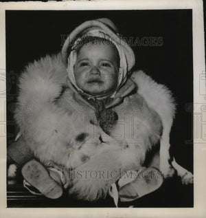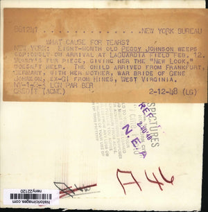 New York: Eight-month old Peggy Johnson weeps copiously on arrival at LaGuardia Field Feb. 12. Mummy's fur piece, giving her the "New look," doesn't help. The child arrived from Frankfurt,Germany, with her mother, war Bride of Gene Johnson,EX-GI from Hines West Virginia.