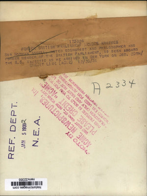 Sir Norman Angell noted economist and philosopher and former member of the British Parliament is seen aboard the SS Majestc as he arrived in NY on Dec 29th