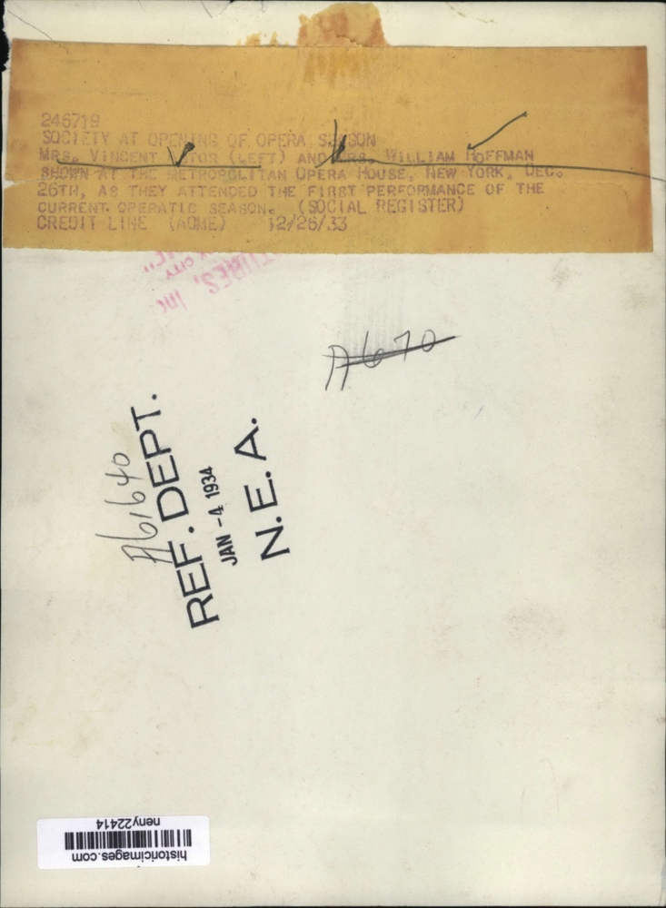 MRS VINCENT ASTOR (LEFT) AND MRS WILLIAM HOFFMAN SHOWN AT THE METROPOLITAN OPERA HOUSE NEW YORK DEC 26TH AS THEY ATTENDED THE FIRST PERFORMANCE OF THE