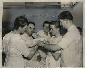 At the theoretical and practical first aid demonstration for drivers of the American Volunteer Ambulance Corp., who will soon embark for active service in France, Instructor G.Ward Callum of Greenboro N. Car. demonstrates to Warren Brandt also of Greenboro how splints should be placed on a broken arm. Clyde Jensen of Council Bluffs Ia. is the patient Class was held at the French Hospital June 4