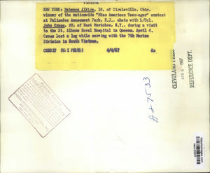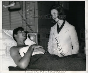 Rebecca Alkire 18 of Circleville Ohio winner of the nationwide Miss American Teenager contest at Palisades Amusement Park NJ chats with LCpl John Cross 20 of East Moriches NY during a visit to the St Albans Naval Hospital in Queens April 4. Cross lost a leg while serving with the 7th Marine Division in South Vietnam.
