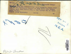 May Day demonstrators carru placards urging freedom for the Communist Eleven as they march down 8th avenue past Penn Station May 1 The turnout was an estimated 75,000