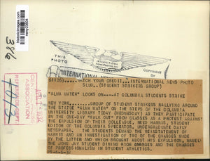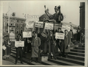 Group of student strikers rallying around the statue Alma Mater on the steps of the Columbia Univ Library as they participate in the one day walk out from classes as a protest against the expulsion of their Colleague, Reed Harris student editor of the Columbia Spectator, undergraduate daily newspaper. The Student demand the reinstatement of by the latter and which brought about his expulsion namely the John Jay Student dining Room charges and the charges of the professionalism in student Athletics