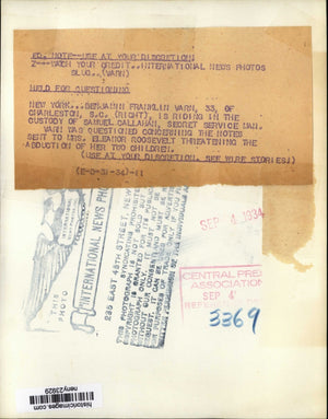BENJAMIN FRANKLIN VARN 33 OF CHARLESTON S.C. (RIGHT) IS RIDING IN THE CUSTODY OF SAMUEL CALLAHAN SECRET SERVICE MAN. VARN WAS QUESTIONED CONCERNING THE NOTES SENT TO MRS ELEANOR ROOSEVELT THREATENING THE ABDUCTION OF HER TWO CHILDREN.