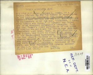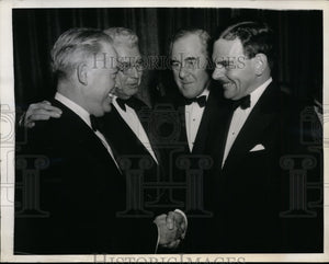 GOV THOMAS E DEWEY IN A SPEECH TONIGHT BEFORE THE BUREAU OF ADVERTISING OF THE AMERICAN NEWSPAPER PUBLISHERS ASSN ASSERTED THAT BRITAIN AND THE US MUST CONTINUE TO COLLABORATE AFTER THE WAR "TOGETHER, I HOPE WITH RUSSIA AND CHINA" IF GERMANY AND JAPAN ARE TO BE RENDERED PERMANENTLY HARMLESS. THIS WAS GOV DEWEY'S FIRST EXPRESSION OF HIS VIEWS ON FOREIGN POLICY SINCE THE REPUBLICAN MACKINAC CONFERENCE LAST YEAR. HERE, AS THEY CHATTED AT THE DINNER, ARE (LEFT TO RIGHT): ROY MOORE OF THE BRUSH-MOORE NEWSPAPERS, CAMPAIGN MANAGER FOR GOV JOHN W BRICKER OF OHIO; FRANK TRIPPE, GENERAL MANAGER OF THE GANNETT NEWSPAPERS, AND CHAIRMAN OF THE BUREAU OF ADVERTISING OF THE ANPA; EDWIN S FRIENDLY, TREASURER OF THE ANPA, AND VICE PRESIDENT AND GENERAL MANAGER OF THE NY AND SUN, AND GOV DEWEY