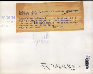 Mayor FH LaGuardia on his way to plane stops to chat with youngsters visiting the airport. Newbold Morris President of City Council saw the Mayor off.