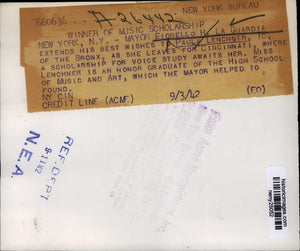 MAYOR FIORELLO H LAGUARDIA EXTENDS HIS BEST WISHES TO PAULA LENCHENER 18, OF THE BRONX AS SHE LEAVES FOR CINCINNATI WHERE A SCHOLARSHIP FOR VOICE STUDY AWAITS HER. MISS LENCHENER IS AN HONOR GRADUATE OF THE HIGH SCHOOL OF MUSIC AND ART WHICH THE MAYOR HELPED TO FOUND.