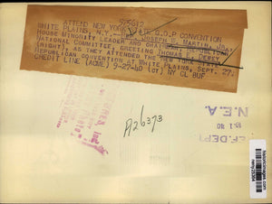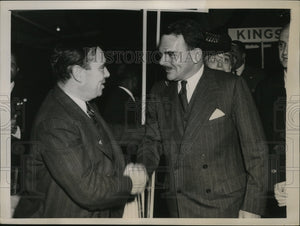 Rep Joseph W Martin House Minority leader and chairman Republican National Committee greeting Thomas E Dewey right as they attended the NY State Republican convention at White Plains Sept 27