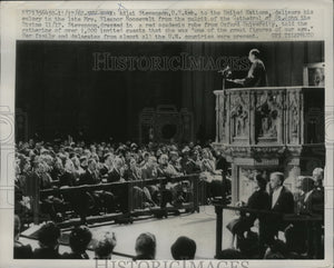 Adlai Stevenson,U.S. Ambassador to the United Nations, delivers his eulogy to the late Mrs. Eleanor Roosevelt from the pulpit of the Cathedral of John the Divine 11/17. Stevenson,dressed in n red academic robe from Oxford University, told the gathering of over 1,000 invited guests that she was "one of the Great Figures of our age." her family and delegates from almost all the U.N. countries were present.