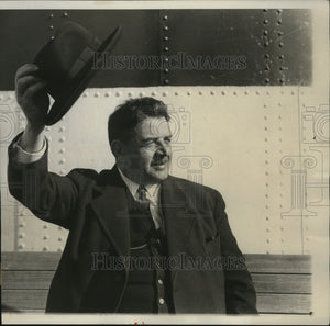WAVING HIS HAT, FORMER PREMIER EDOUARD HERRIOT OF FRANCE, WHO WILL REPRESENT HIS COUNTRY IN THE CONFERENCE IN D.C. WITH PRES ROOSEVELT AND PRIME MINISTER J. RAMSAY MACDONALD OF ENGLAND, IS SHOWN UPON HIS ARRIVAL ON THE ILE DE FRANCE.
