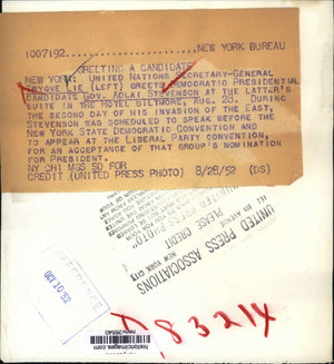 United Nations Secretary-General Trygve Lie (left) greet Democratic Presidential Candidate Gov. Adlai Stevenson at the latte's suit in the hotel Biltmore Aug. 28. During the second day on his invasion of the East Stevenson was scheduled to speak before the N.Y. State Democratic Convention and appear at the Liberal Party Convention for an acceptance of the groups nomination fr President