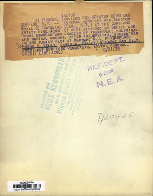 Suffern NY Funeral services for Senator Royal S Copeland Dem of NY at the Copeland estate here June 21 were atteended by Senate and House members and leaders of fraterna, political and medicaal groups After the services burial was in family plot at Mahwan NJ Frank V Kelly, James A Farley, Cincent Daly prominent NY Democrats at the funeral