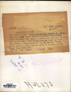 Governor elect Thomas E Dewey and his wife read congratulatory telegrams from friends and well wishers on the day after his election. The first Republican to win NYs Governorship in 20 years Dewey slid easily into office with a plurality of more than 600,000