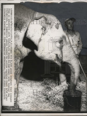 1955 Press Photo Trainer Joe Strickland with Elephant Vicki after her escape
