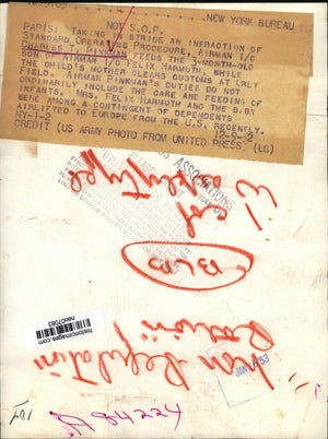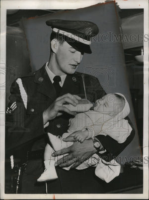 1952 Press Photo Airman Charles T. Pinkman feeds son of Felix Harmuth at Orly