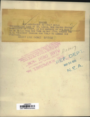 1933 Press Photo Breckenridge Long, New US Ambassador to Italy, Bids Wife Adieu