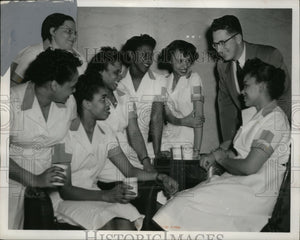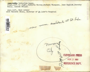 Nurse Asst. at St. Luke Catherine Logan, Alberta Murray, Jane English, Barbara Thompson, Dorothy Kelly, Azalea Shipps, Mary Armour with Kenneth Shoos the dir. of St. Lukes Hospital.