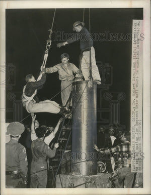 1949 Press Photo Dr. Robert McCulloch hoisted before descent into well in CA