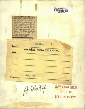 1951 Press Photo Frieda Helwig w/ Cleveland Blood Shipment for Korea - neo16070