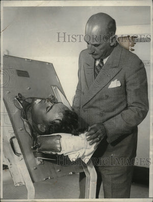 1932 Press Photo Dr. J.E. Gregory Testing Cyanide Antidote on Cuthbert Riley