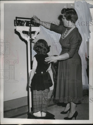 1958 Press Photo Klara Bauer Measured by Dale Clark on Scale - neo19018