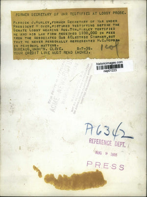 1935 Press Photo Patrick Hurley former Secretary of War at Senate hearing