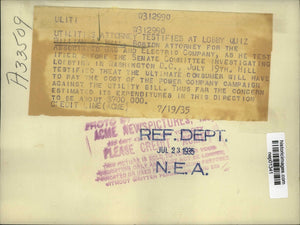1935 Press Photo William Hill Boston atty for Associated Gas Electric at Senate